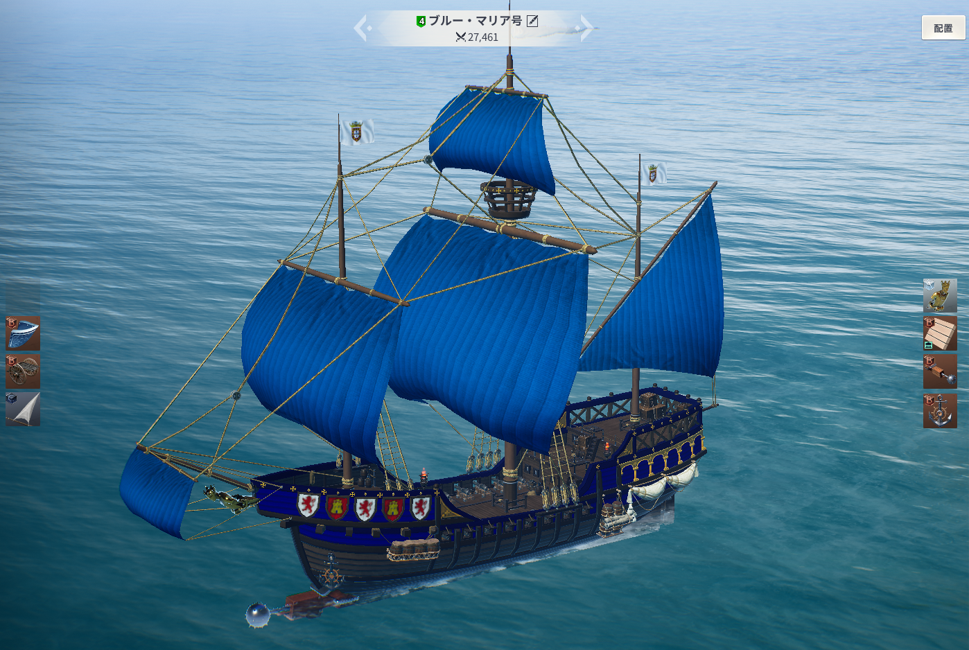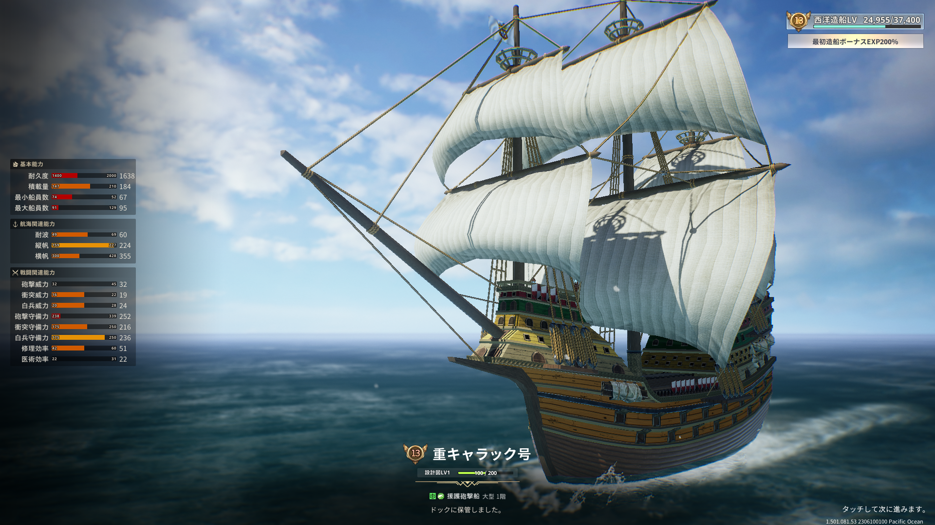 ランク13の船の初回造船を終えました。最後の重キャラック船は1回目からそこそこのスペックだったのでひと安心でした。14はまだまだ先なので、大型スクーナーとラ・レアル、重キャラックのこの組み合わせで当面は航海を楽しみたいと思います。すべてランク13で揃えても、耐波95はなかなか難しそうです。