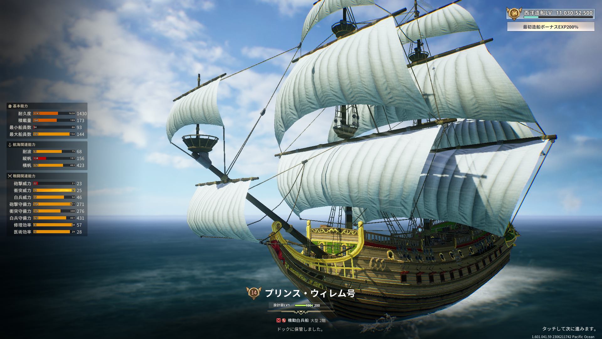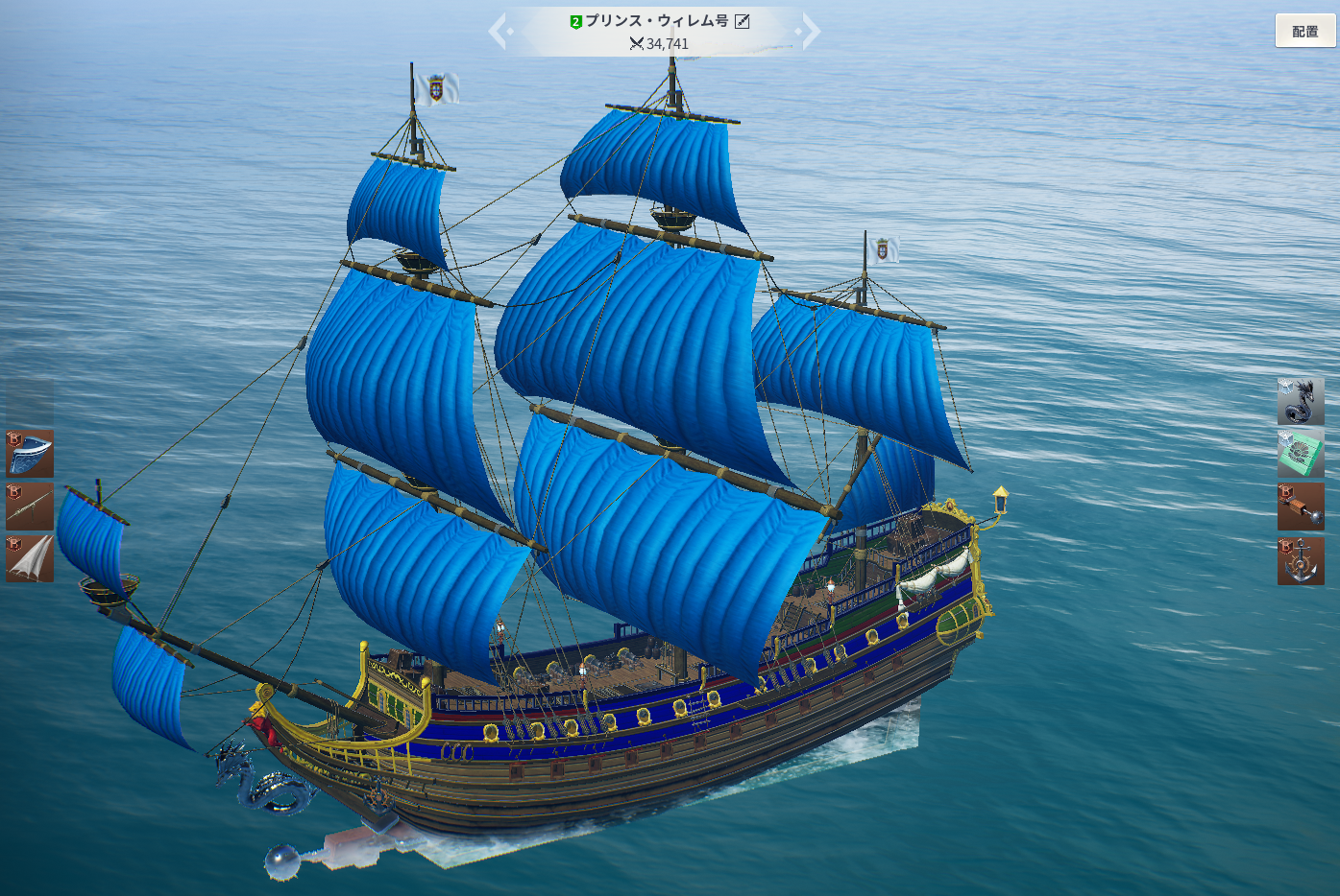 プリンス・ウィレム船を組み込みました。冒険と交易の効果は若干下がりましたが、航海士の育成でカバーできる範囲でした。
