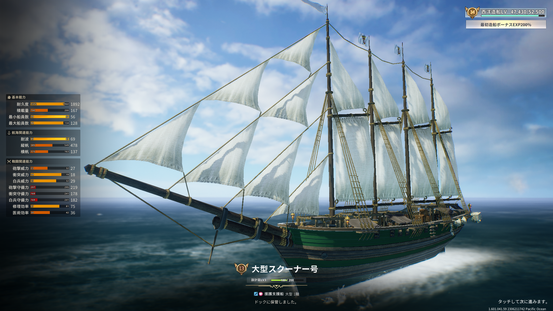 大型スクーナーの耐波ガチャで久しぶりに最大値が出ました。設計図LVが上がると高スペックになる確率も上がるようですがこれはちょっと嬉しい出来事でした。あまり期待していなかったので。(^^♪