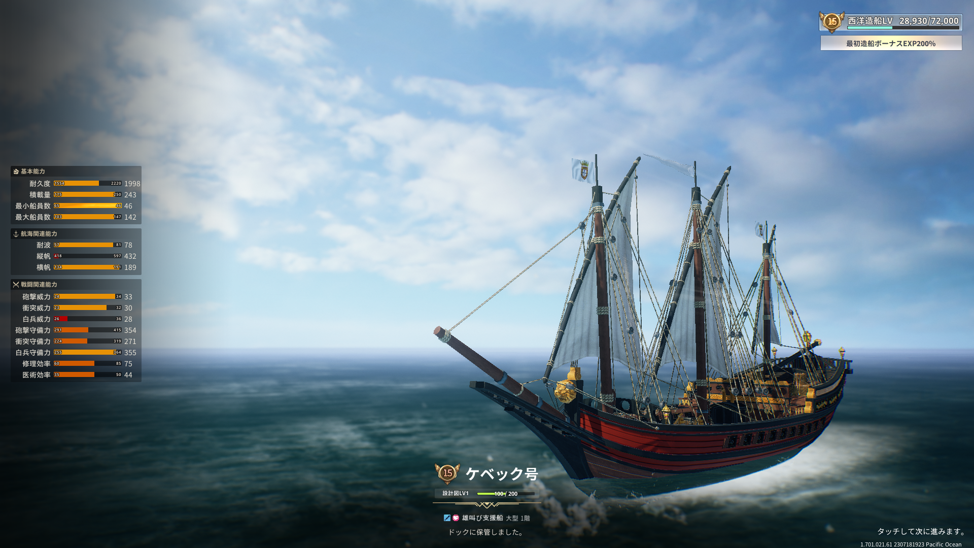 ケベック船に続き、ランク15の造船を続けています。造船時間がアップデートによって短縮されたので、ペースアップになるかと思いましたが、材料集めはなかなか難しいので、結局はそれほど変わらない気がします。