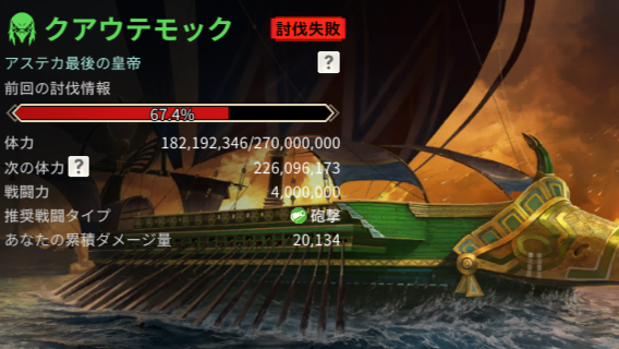 討伐チャレンジは3連続の失敗です。全く貢献できない参加賞狙いですが、成功と失敗ではそれなりに報酬が違うので、他力本願ですが成功が良いかなと思っています。単純にアクティブが減っているのか、偶然にも強者さんらが参加できていないのか・・