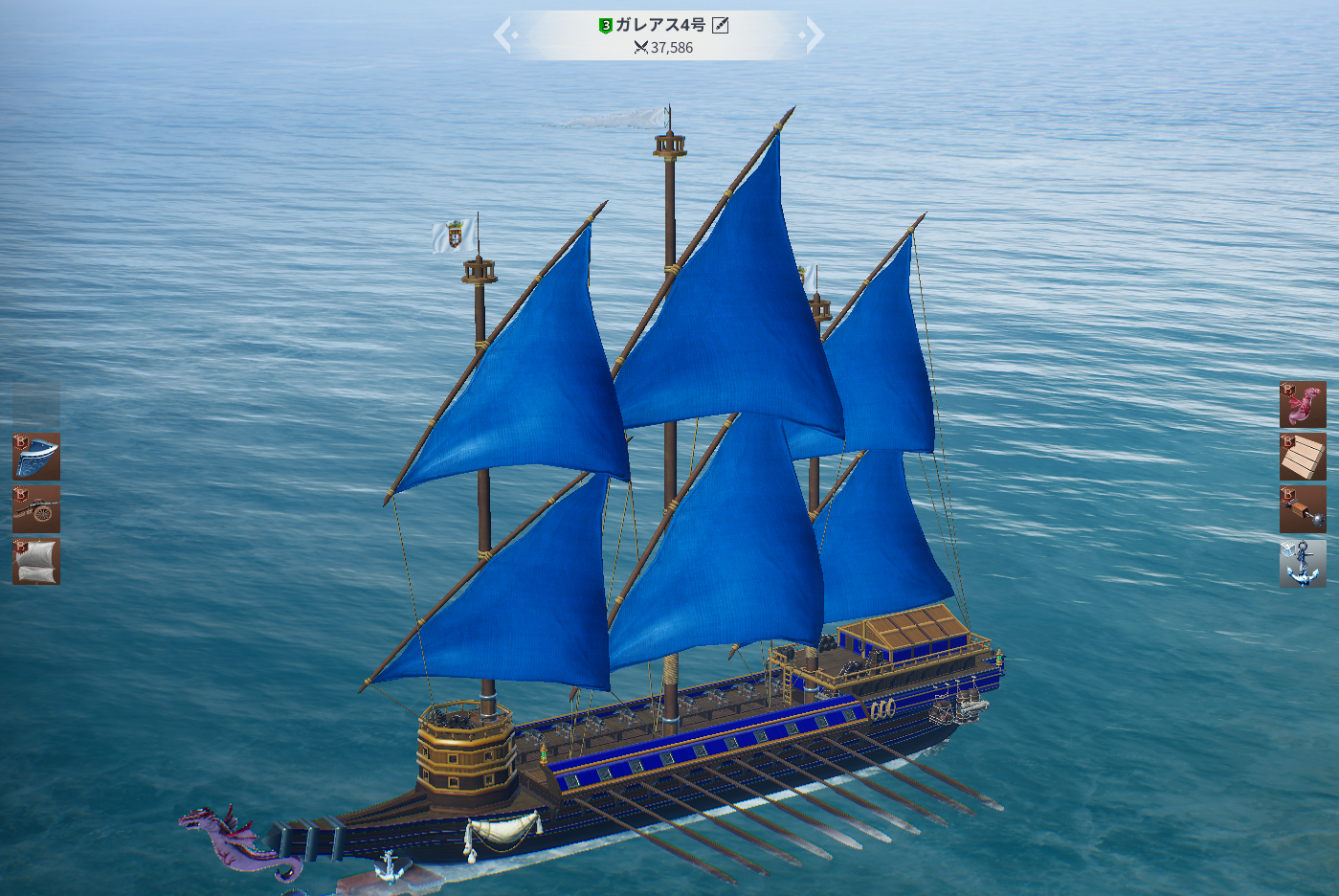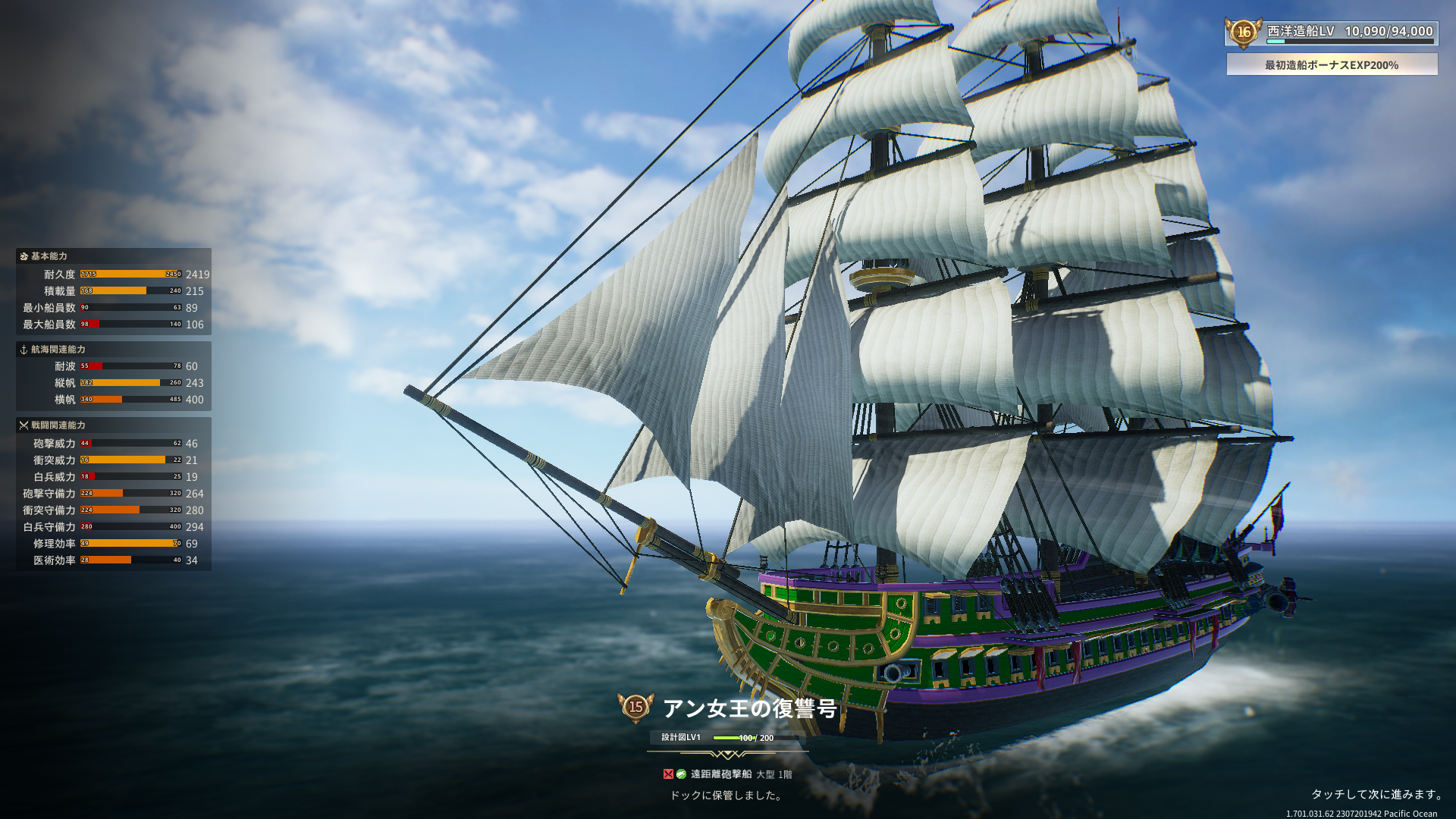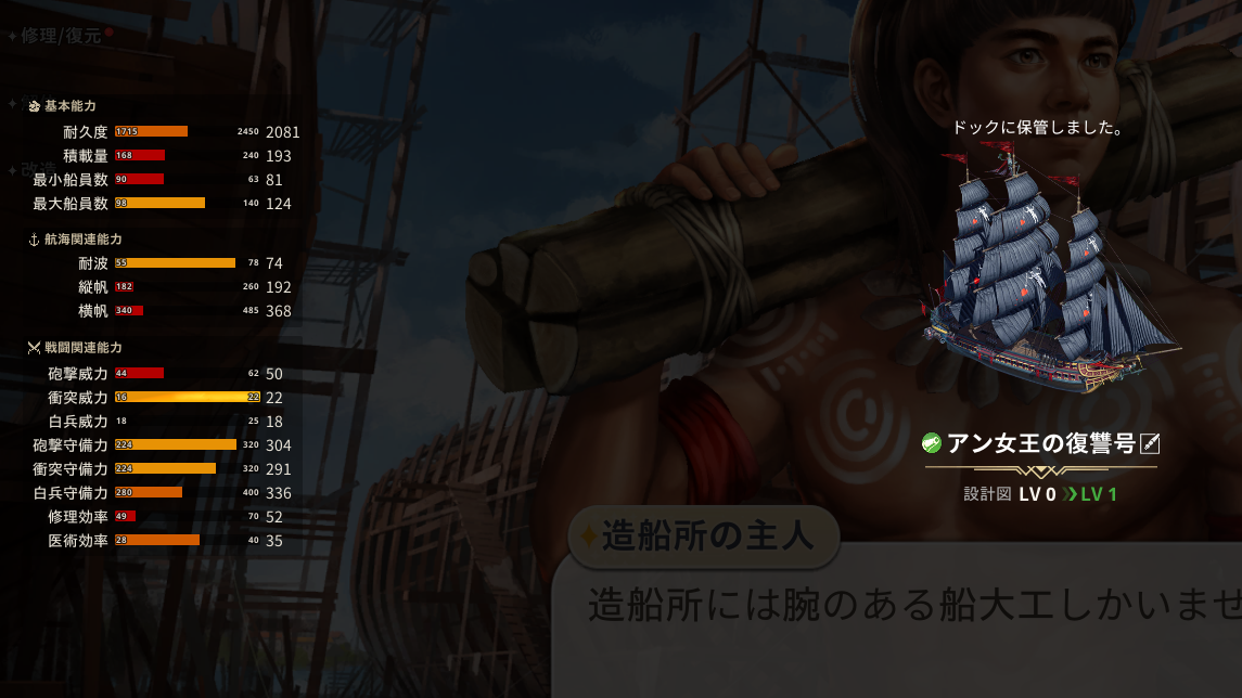 なんとかアン女王の復讐船(ランク15)の造船材料を集めて、造船して、それが完了しました。楽しみに出庫させましたが、やっぱり微妙でした。それでも何とか使えるくらいには修正できたので、これで戦闘用のみで第一艦隊を編成して、今後は進みたいと思います。