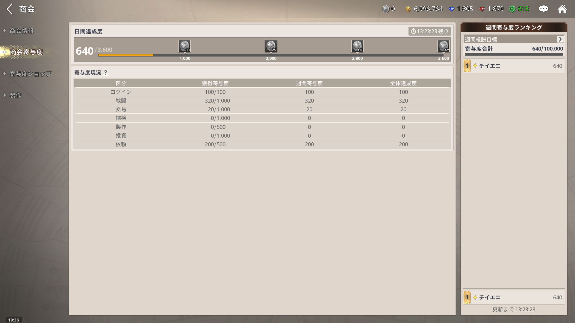 - 1日フルに活動すれば、寄与度3,600で商会通貨を1,000獲得でき、これを有効活用していくことがポイントとなる。